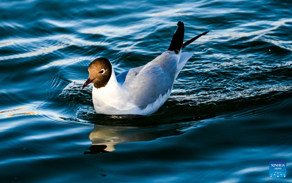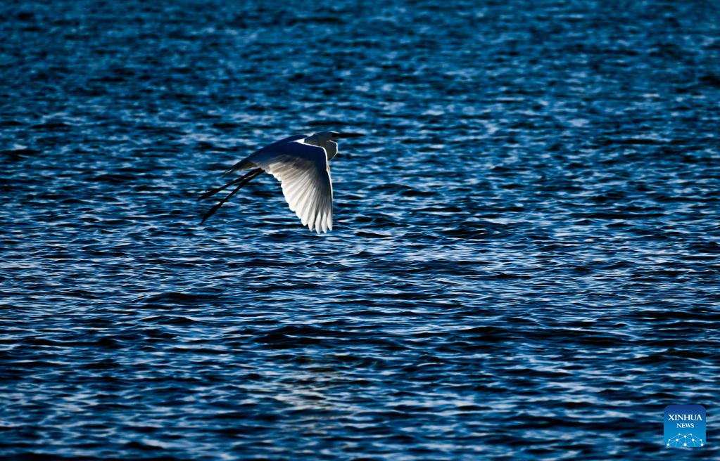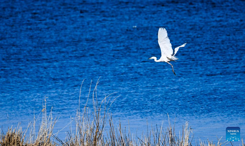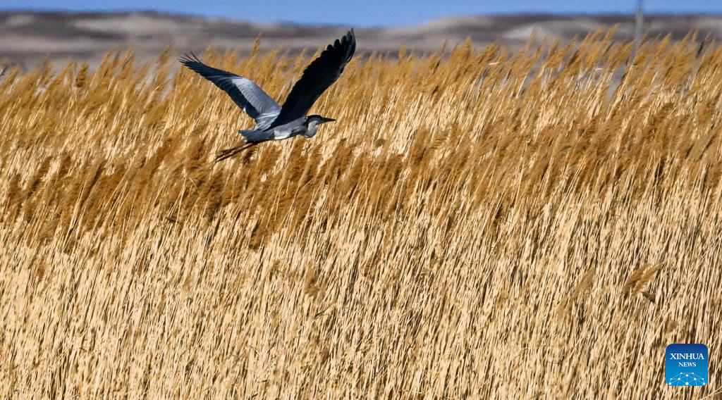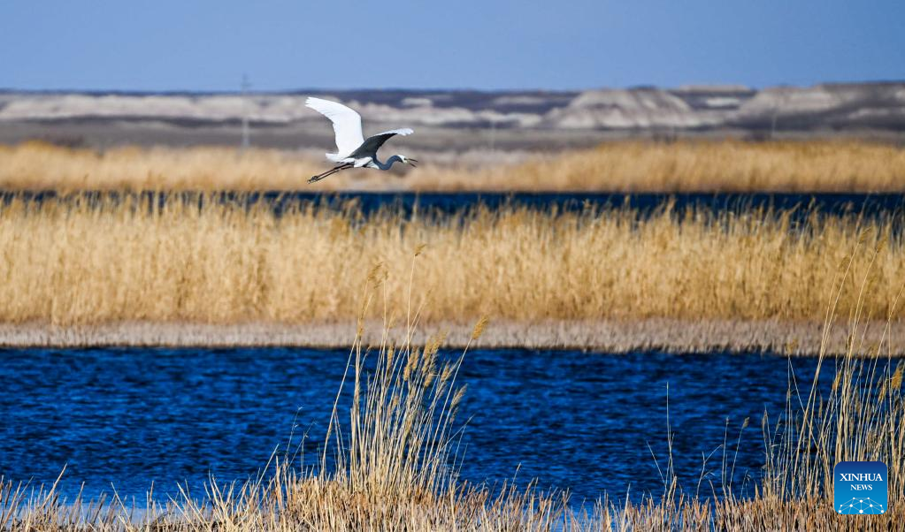 A migrant bird is pictured at Juyanhai wetland in Ejina Banner of Alxa League, north China's Inner Mongolia Autonomous Region, April 13, 2022. (Xinhua/Peng Yuan)