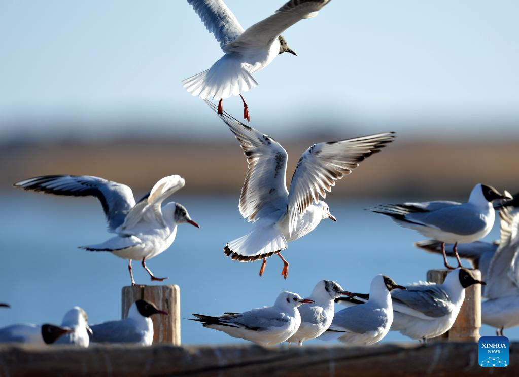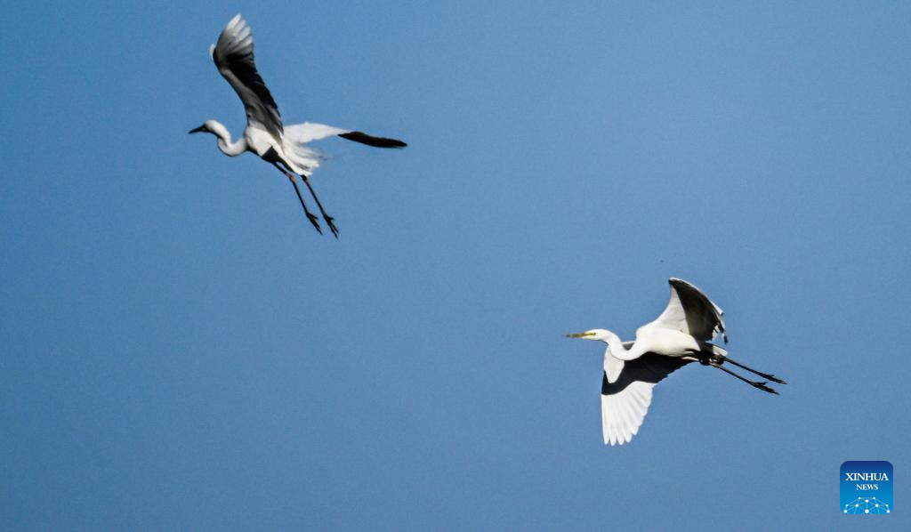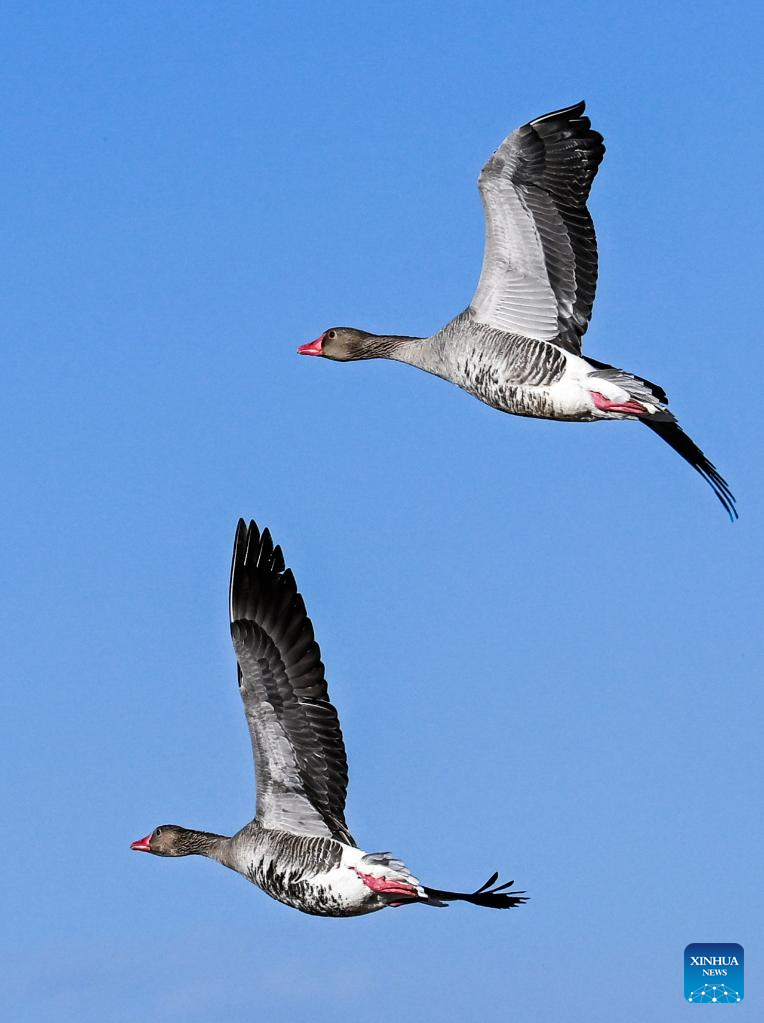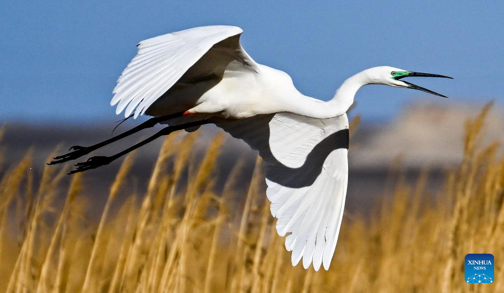 Migrant birds are pictured at Juyanhai wetland in Ejina Banner of Alxa League, north China's Inner Mongolia Autonomous Region, April 13, 2022. (Xinhua/Ren Junchuan)