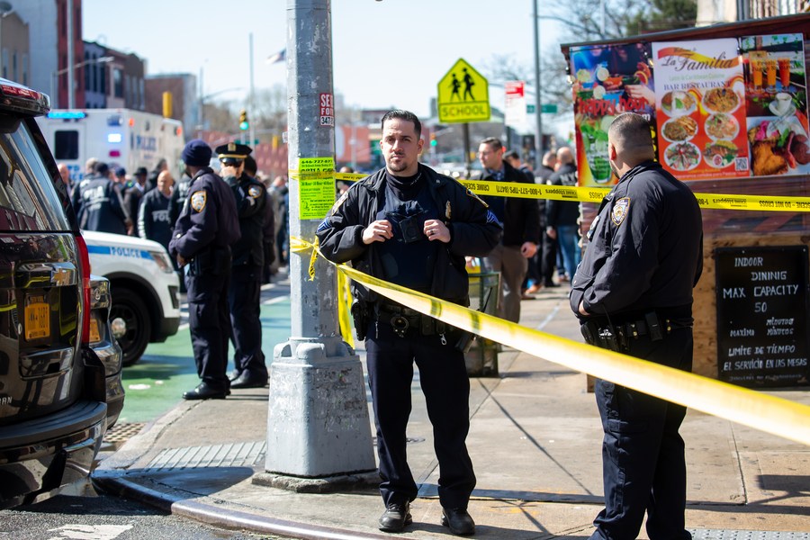 Police stand guard at a nearby street after a shooting took place at a subway station in Brooklyn, New York, the United States, on April 12, 2022. (Photo by Michael Nagle/Xinhua)