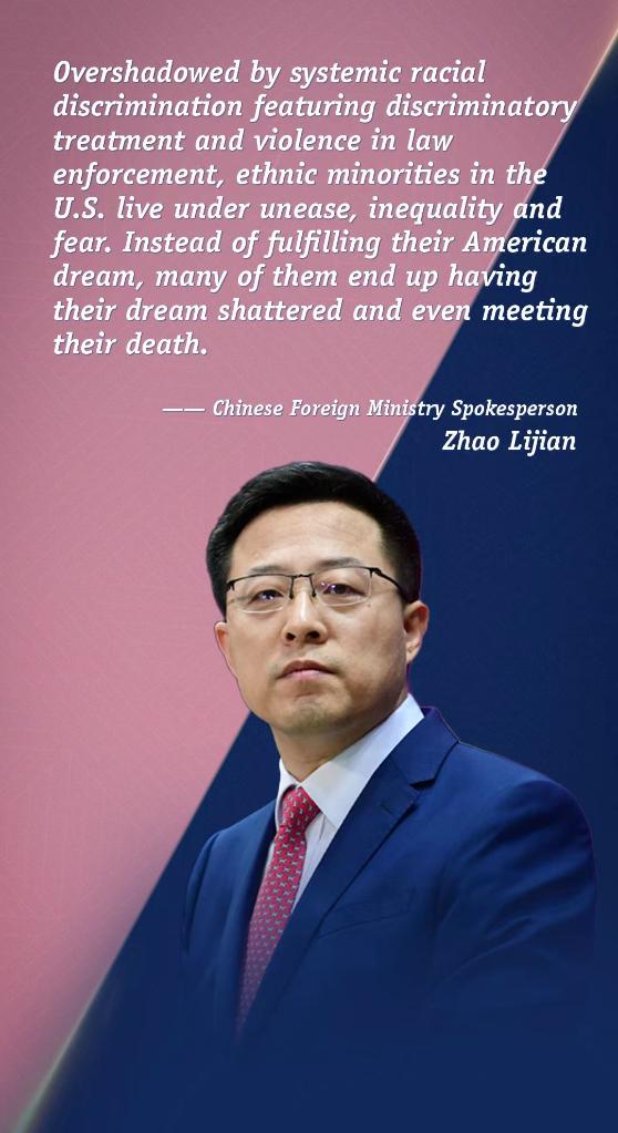 "Overshadowed by systemic racial discrimination featuring discriminatory treatment and violence in law enforcement, ethnic minorities in the United States live under unease, inequality and fear. Instead of fulfilling their American dream, many of them end up having their dream shattered and even meeting their death," Zhao stressed.