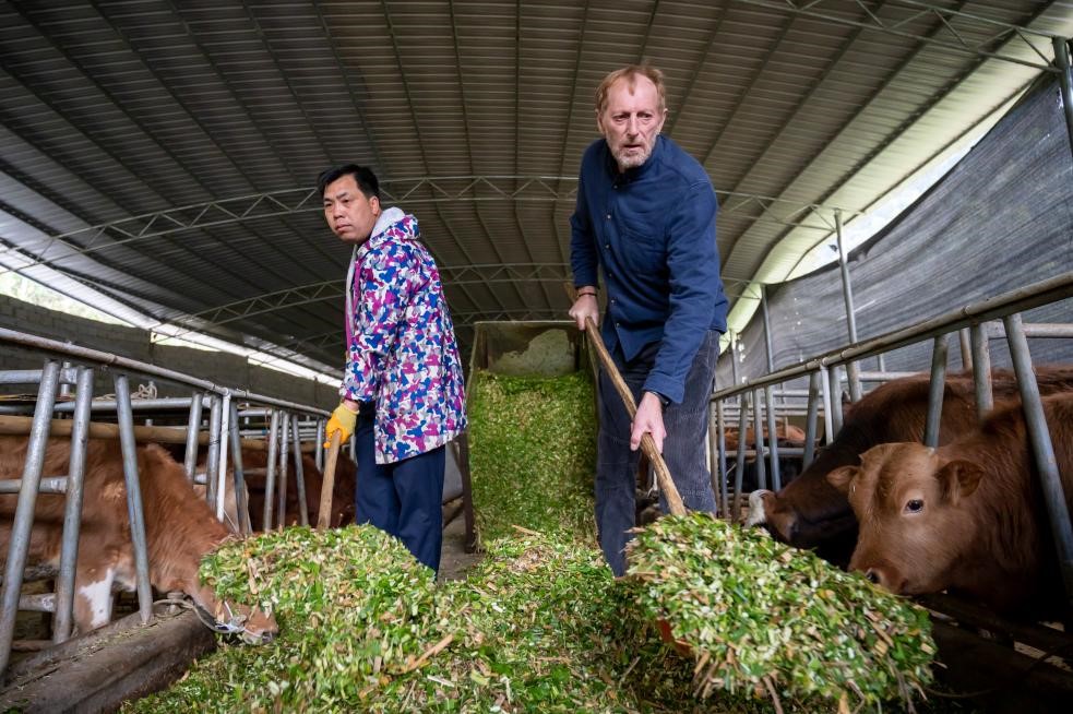 Nick, a retired police officer from Luxembourg, volunteers to work at a cattle farm operated by the breeding cooperative of Zhadong village, Hechi city, south China’s Guangxi Zhuang autonomous region. (Photo/Yan Lizheng)