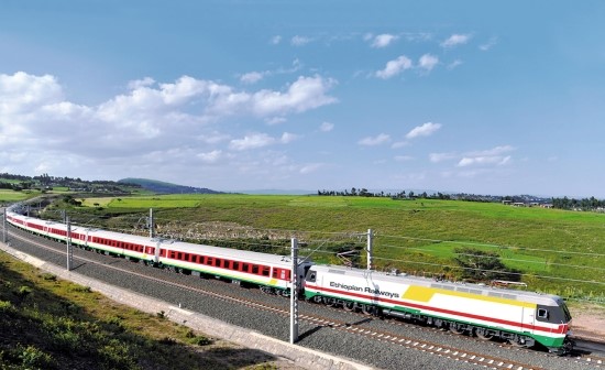 A train runs along the China-built Addis Ababa-Djibouti Standard Gauge Railway. (Photo courtesy of the China Civil Engineering Construction Corporation)
