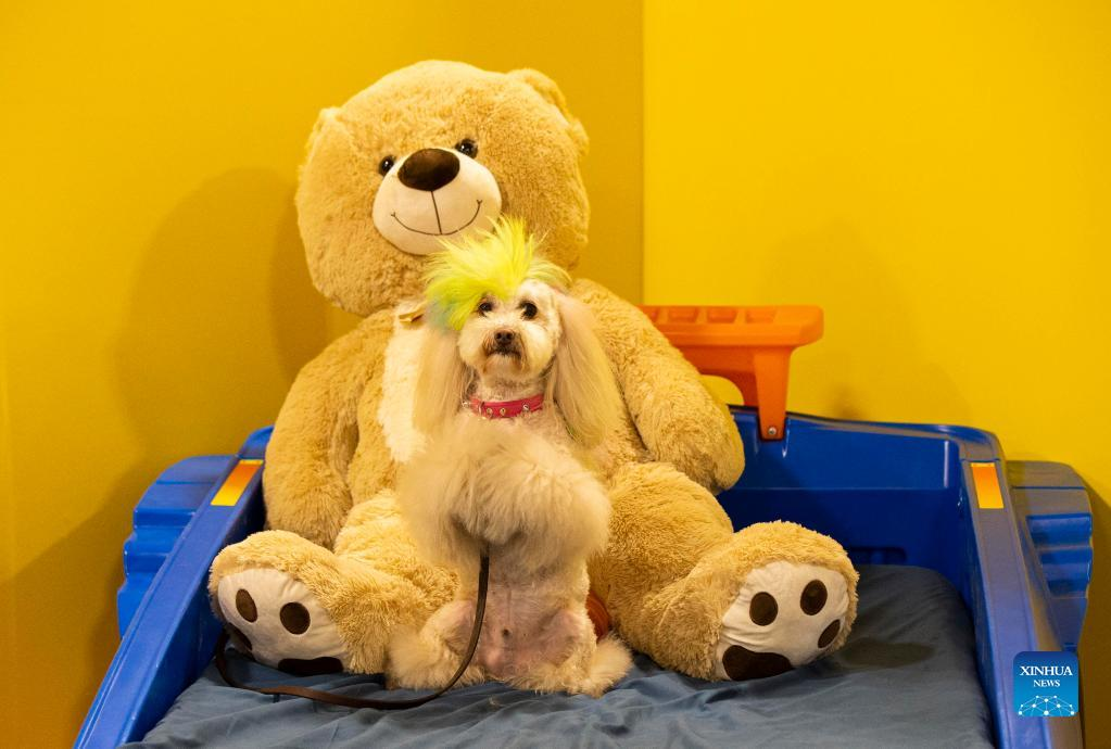 A pet groomer works on a pet dog during the 2022 Spring Canadian Pet Expo in Mississauga, the Greater Toronto Area, Canada, on April 15, 2022. Featuring a pet market, competitions, photo booths and more, the annual event is held here from Friday to Sunday. (Photo by Zou Zheng/Xinhua)
