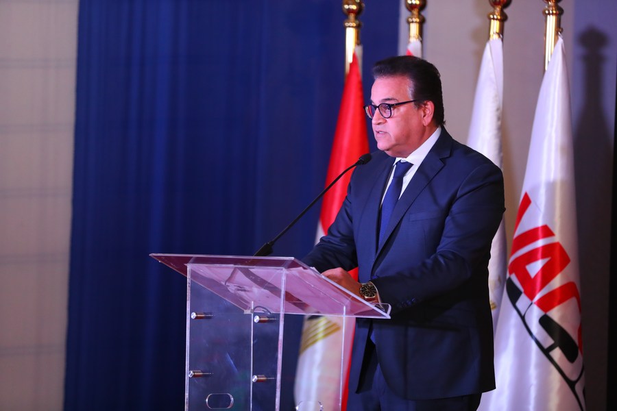 Egypt's higher education and scientific research minister and acting health minister Khaled Abdel Ghaffar gives a speech while attending the commencement ceremony for a vaccine cold storage facility donated by China, in Giza, Egypt. (Xinhua/Sui Xiankai)