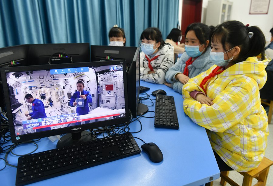Primary students in Zigui county, Yichang, central China’s Hubei province watch the second live class given by Shenzhou-13 crew members, March 23, 2022. (Photo by Wang Huifu/People’s Daily Online)