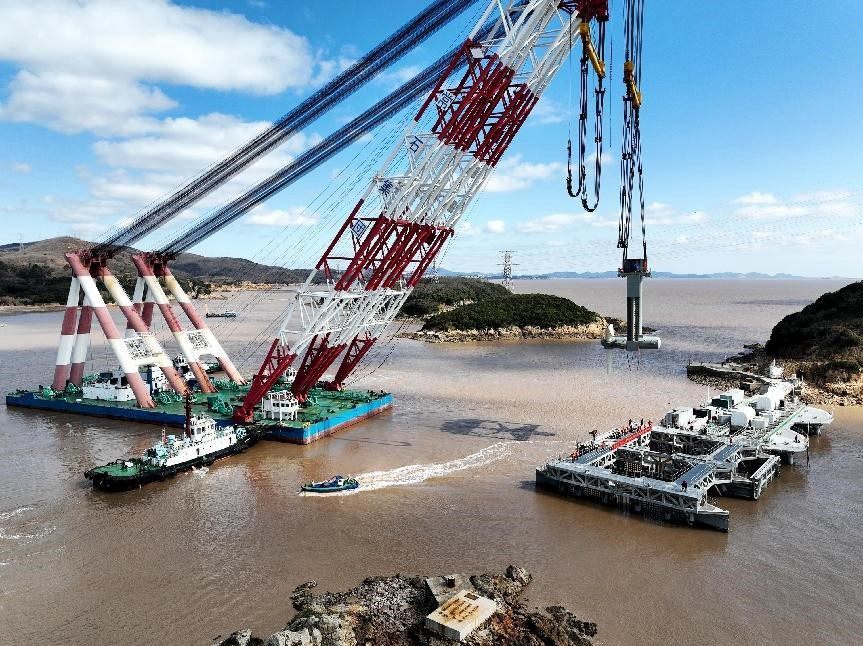 A fourth-generation tidal power generator unit independently developed by China is put into sea in Zhoushan, east China’s Zhejiang province, Feb. 24, 2022. The unit weighs 350 tonnes and has a capacity of 1.6 MW. (Photo by Yao Feng/People’s Daily Online)
