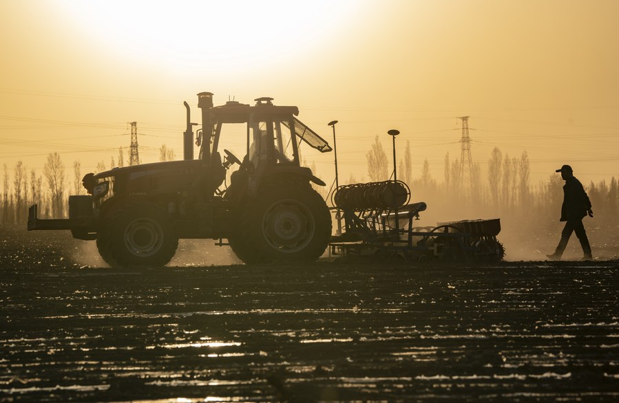 Tractors plow in a cotton field in Shiqiao Township of Usu City, northwest China's Xinjiang Uygur Autonomous Region, March 31, 2022. (Xinhua/Zhao Ge)