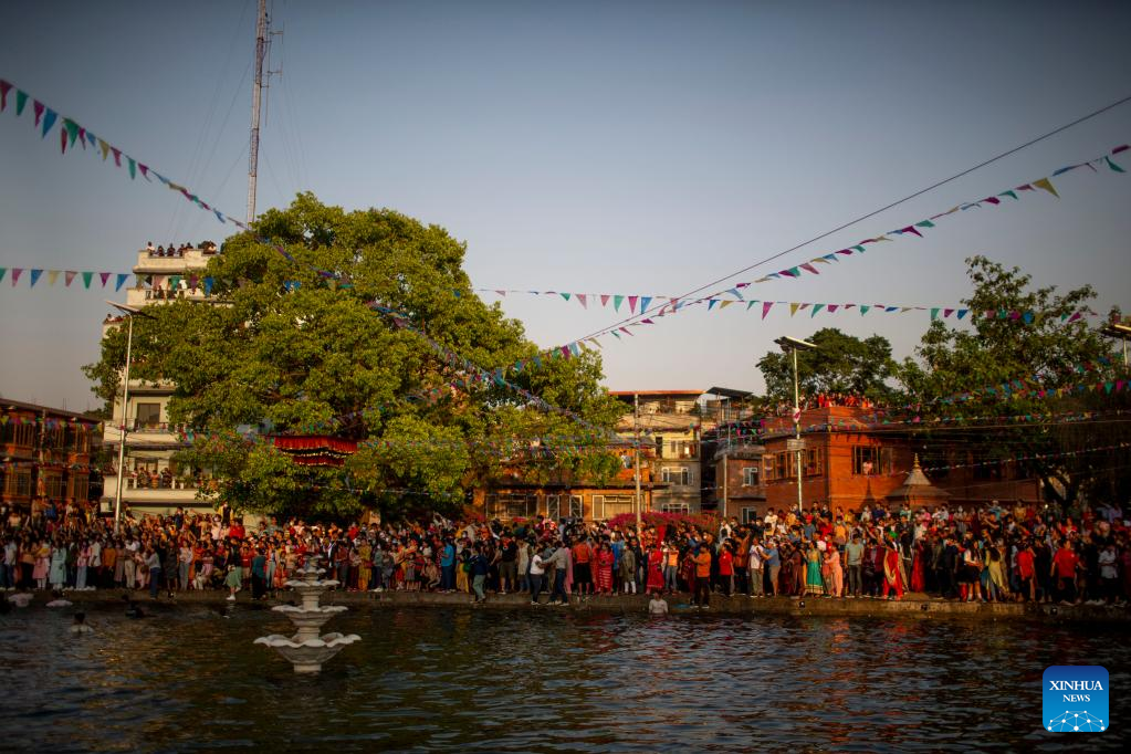 Nepalese are seen on the bank of Gahana Pokhari (Jewel Pond) as the chariot of Tundaldevi is carried in the pond during the traditional "Gahana Khojne Jatra" festival in Kathmandu, Nepal, April 17, 2022. (Photo by Sulav Shrestha/Xinhua)