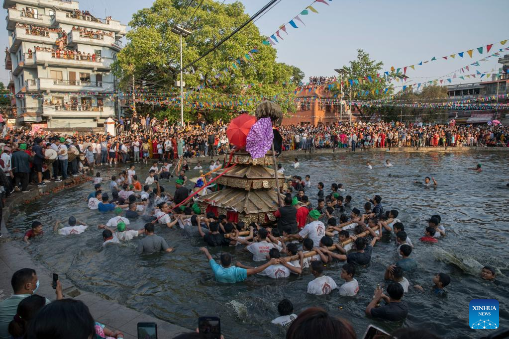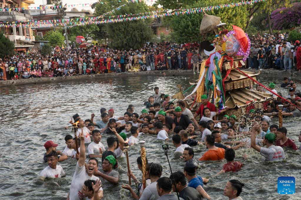 Local people carry the chariot of Tundaldevi on their shoulders and search for the lost jewellery during the traditional "Gahana Khojne Jatra" festival in Gahana Pokhari (Jewel-Pond) in Kathmandu, Nepal, April 17, 2022. (Photo by Sulav Shrestha/Xinhua)