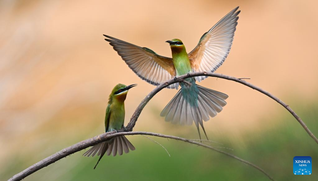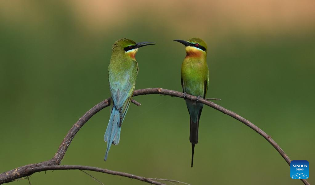 Blue-tailed bee eaters are seen in Haikou, south China's Hainan Province, April 15, 2022. Local authorities of Haikou have made full preparations for bee eaters to build a better habitat during their breeding season. (Xinhua/Yang Guanyu)
