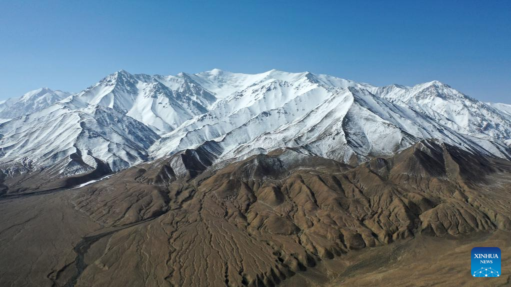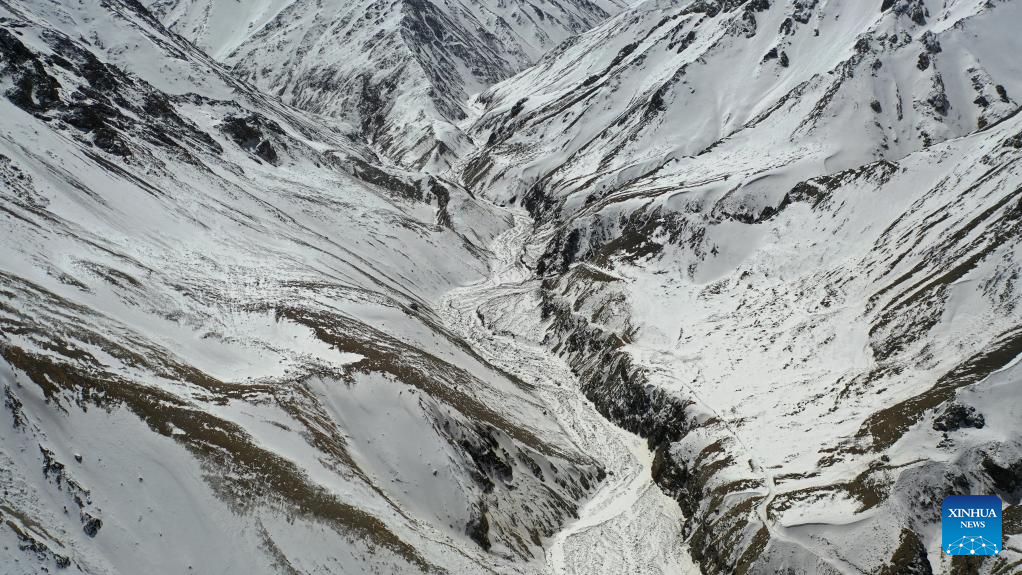 Aerial photo taken on April 17, 2022 shows the snow mountain in Dangchengwan Township of Subei Mongolian Autonomous County, northwest China's Gansu Province. (Xinhua/Chen Bin)