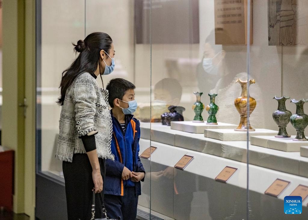 People visit an exhibition in Chongqing China Three Gorges Museum in southwest China's Chongqing, April 17, 2022. The exhibition displays precious cultural relics including bronze wares, ceramics, furniture and murals of the dynasties of Liao (907-1125), Jin (1115-1234), and Yuan (1271-1368). (Xinhua/Huang Wei)