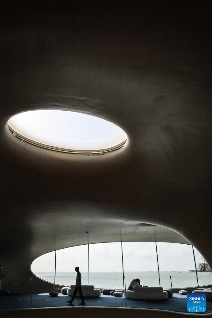 Photo taken on April 16, 2022 shows the Wormhole Library in the Haikou Bay in Haikou, south China's Hainan Province. (Xinhua/Zhang Liyun)