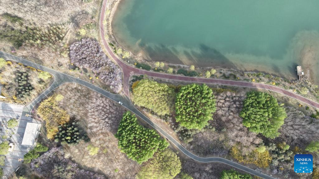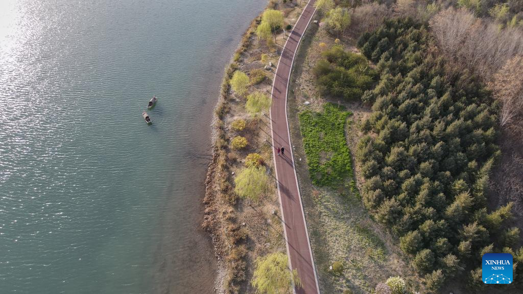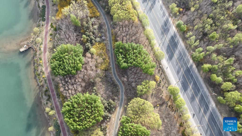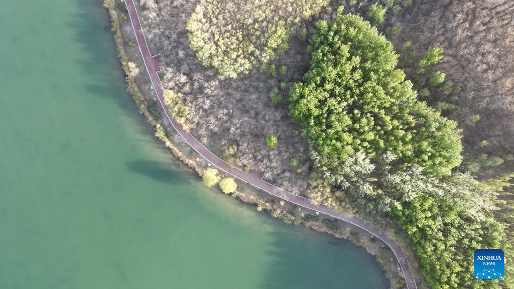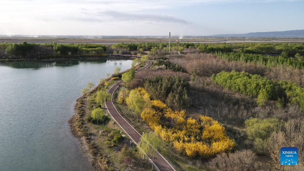 Aerial photo taken on April 18, 2022 shows the scenery of a national wetland park in Zhangye, northwest China's Gansu Province. (Xinhua/Zhang Zhimin)