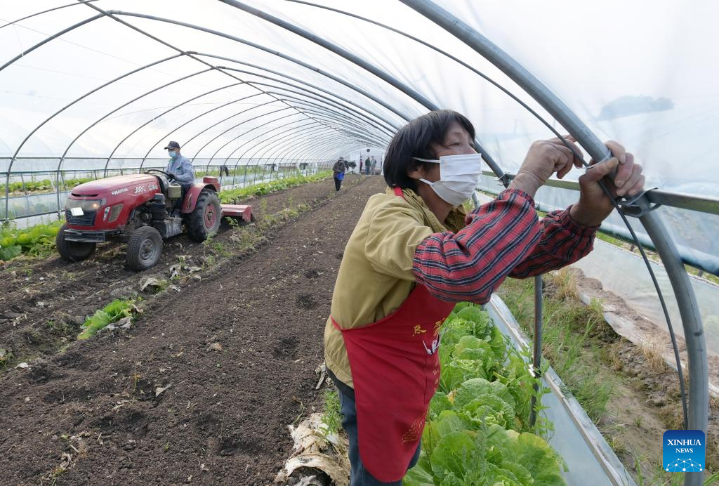 An employee fixes the greenhouse and prepares to plant vegetables at a planting base in Chongming District, east China's Shanghai, April 19, 2022. Vegetable production and processing enterprises in Chongming District have been making efforts to assure the vegetable supply to the urban areas amid the recent COVID-19 outbreak in the metropolis. (Xinhua/Li He)