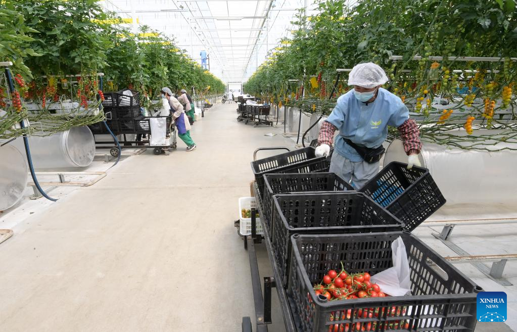 Employees pick tomatoes at a planting base in Chongming District, east China's Shanghai, April 19, 2022. Vegetable production and processing enterprises in Chongming District have been making efforts to assure the vegetable supply to the urban areas amid the recent COVID-19 outbreak in the metropolis. (Xinhua/Li He)