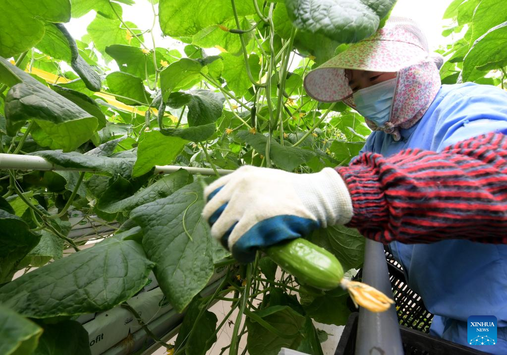 An employee picks cucumbers at a planting base in Chongming District, east China's Shanghai, April 19, 2022. Vegetable production and processing enterprises in Chongming District have been making efforts to assure the vegetable supply to the urban areas amid the recent COVID-19 outbreak in the metropolis. (Xinhua/Li He)