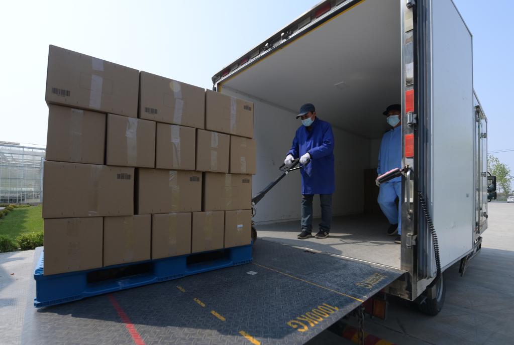 Staff members load packaged vegetables to be sent to the urban areas at a planting base in Chongming District, east China's Shanghai, April 19, 2022. Vegetable production and processing enterprises in Chongming District have been making efforts to assure the vegetable supply to the urban areas amid the recent COVID-19 outbreak in the metropolis. (Xinhua/Li He)