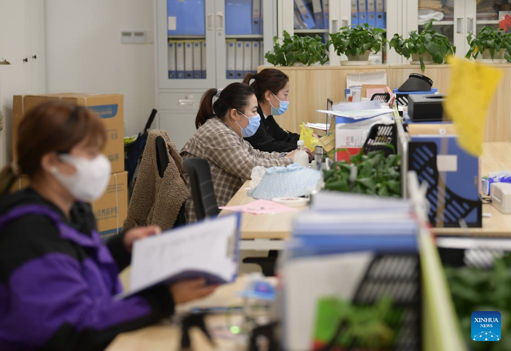 Staff members work in the office at a vegetable planting base in Chongming District, east China's Shanghai, April 19, 2022. Vegetable production and processing enterprises in Chongming District have been making efforts to assure the vegetable supply to the urban areas amid the recent COVID-19 outbreak in the metropolis. (Xinhua/Li He)