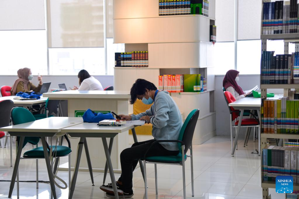 People read at the National Library in Jakarta, Indonesia, April 19, 2022. The National Library of Indonesia has the most comprehensive collection of publications in Indonesia. The manuscripts written on leaves, bark, bamboo and Indonesian native paper record the history, culture and information of Indonesia in various eras. (Xinhua/Xu Qin)