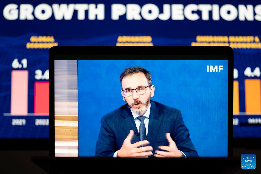 IMF chief economist Pierre-Olivier Gourinchas speaks at a virtual press briefing on World Economic Outlook (WEO) report in Washington, D.C., the United States, on April 19, 2022. The International Monetary Fund (IMF) on Tuesday slashed global growth forecast for 2022 to 3.6 percent amid the Russia-Ukraine conflict, 0.8 percentage points lower than the January projection, according to its newly released World Economic Outlook report. (Xinhua/Liu Jie)