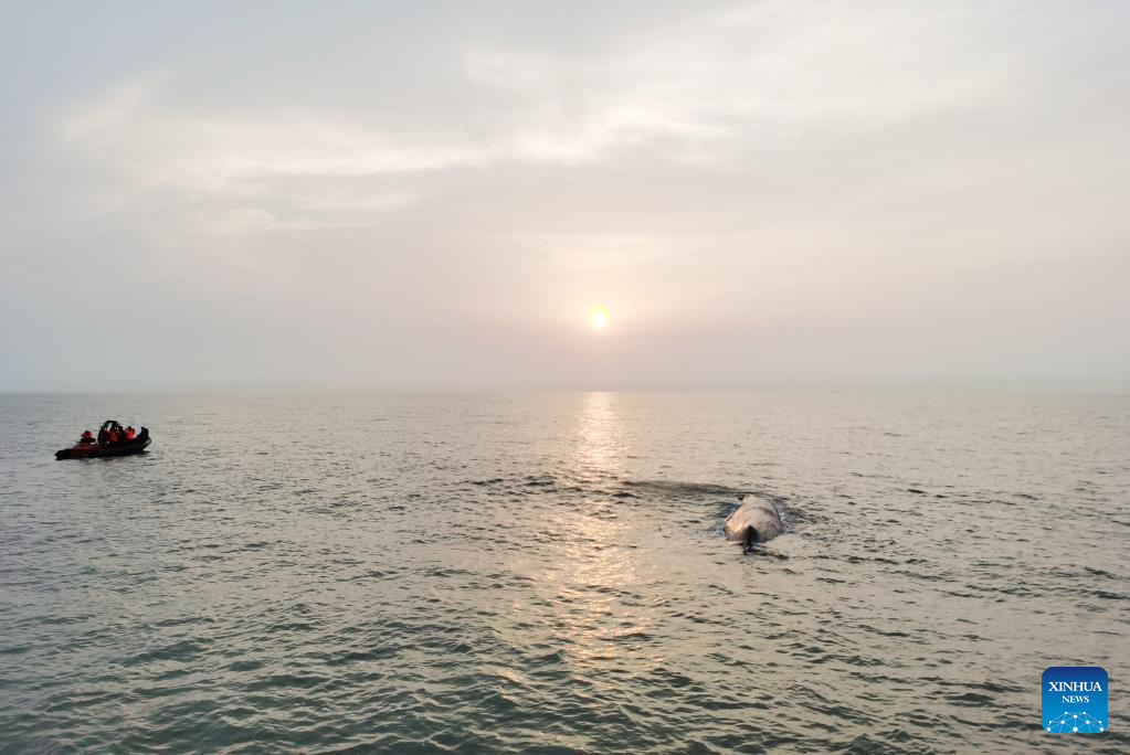 A stranded whale swims back into the sea in Xiangshan County of Ningbo, east China's Zhejiang Province, April 20, 2022.