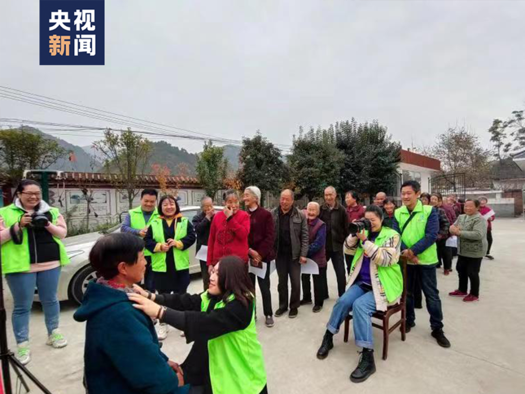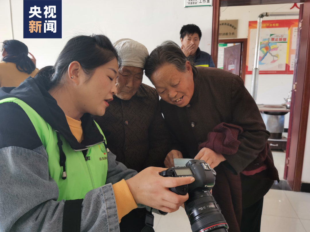 Photo shows Yang Xin taking photos for an elderly resident. (Photo/CCTV)