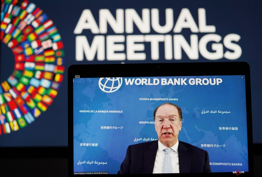 World Bank Group President David Malpass speaks at a virtual news conference during the annual meetings of the World Bank Group and the International Monetary Fund (IMF) in Washington, D.C., the United States, on Oct. 14, 2020. (Xinhua/Liu Jie)