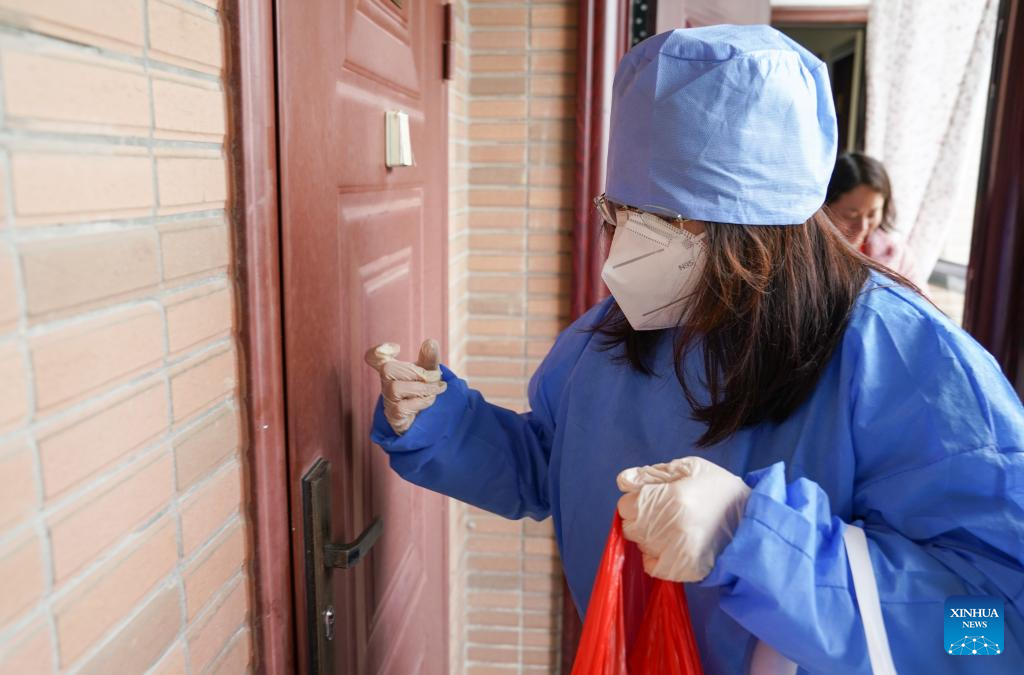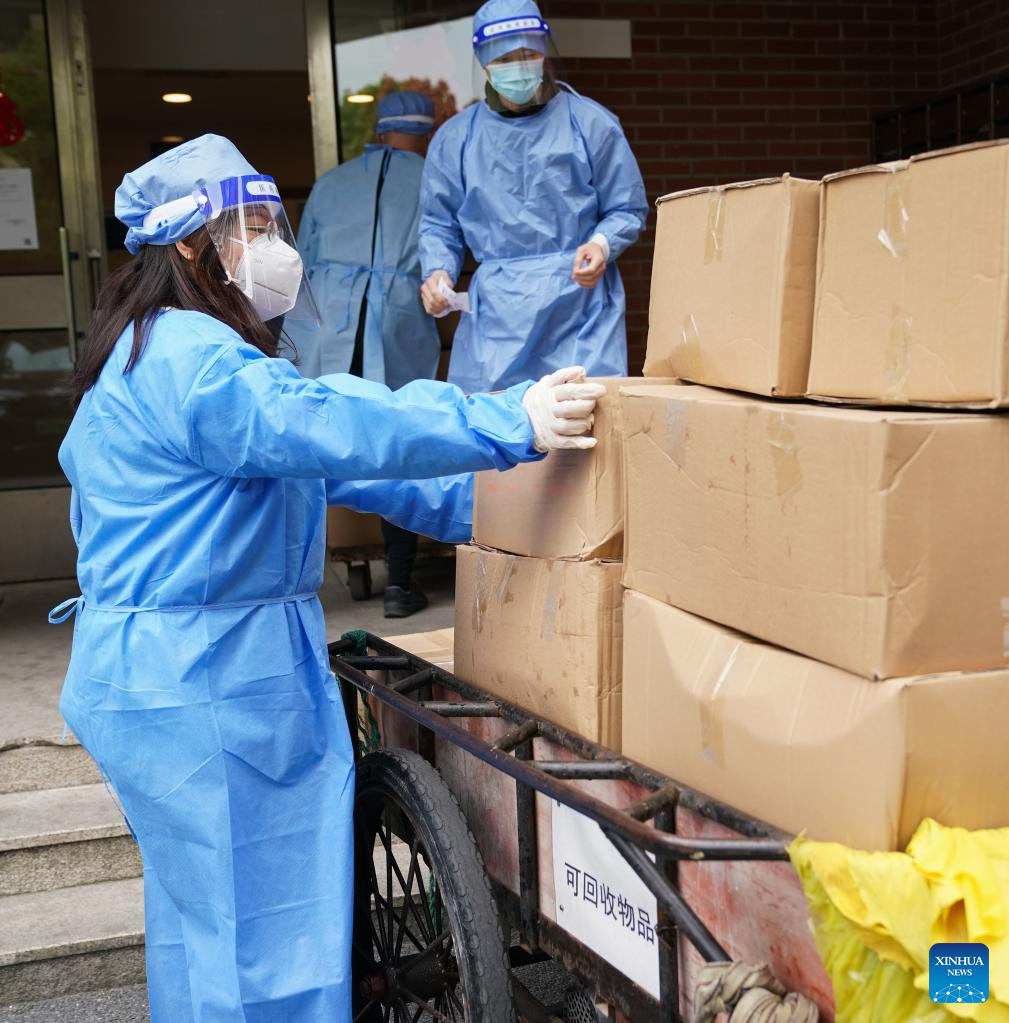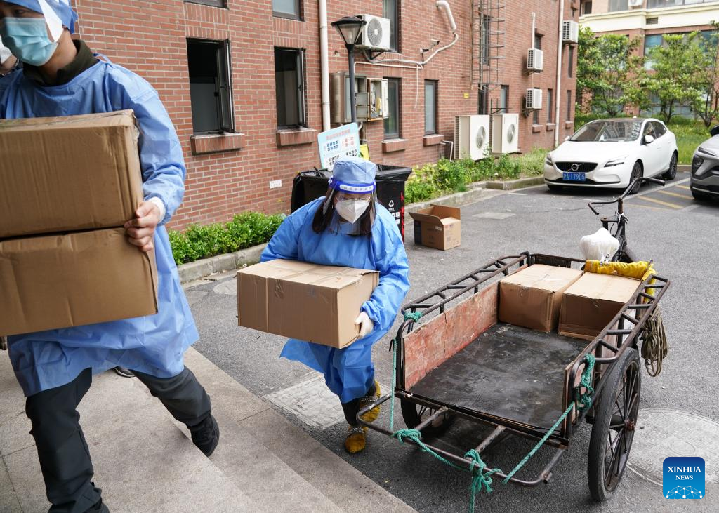 A staff member delivers supplies to residents in a community of Pudong New Area, east China's Shanghai, April 19, 2022. The spread of the epidemic in communities has been effectively contained in China's Shanghai, the municipal health commission told a press conference Wednesday. (Xinhua/Ding Ting)