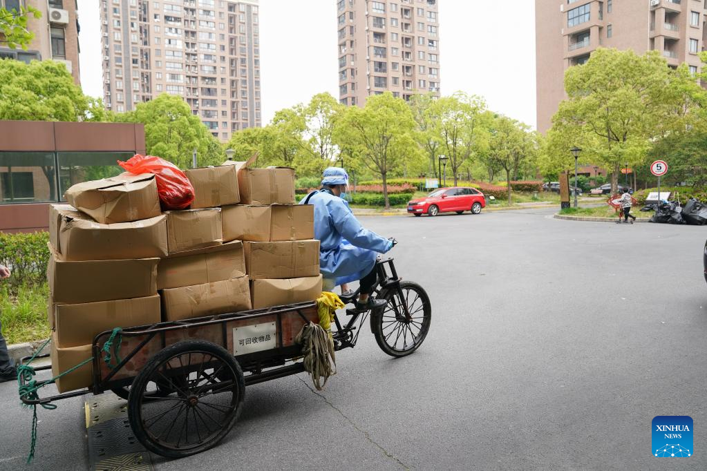 A staff member transports supplies for residents in a community of Pudong New Area, east China's Shanghai, April 19, 2022. The spread of the epidemic in communities has been effectively contained in China's Shanghai, the municipal health commission told a press conference Wednesday. (Xinhua/Ding Ting)