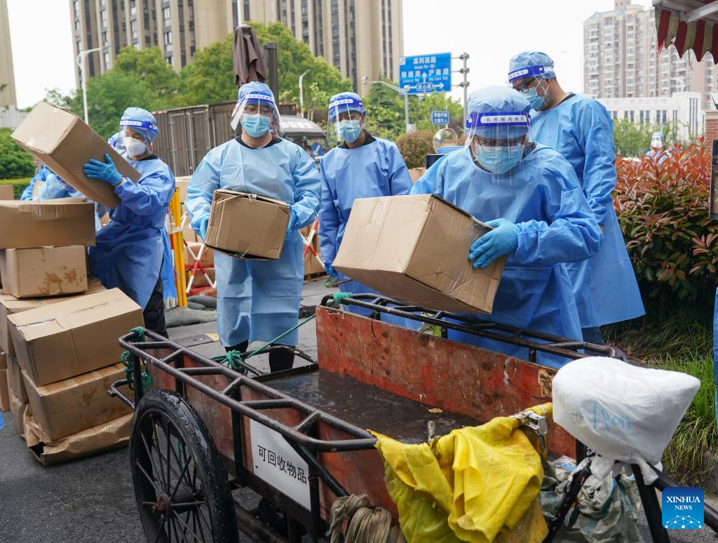 Staff members load supplies for residents onto a pedicab in a community of Pudong New Area, east China's Shanghai, April 19, 2022. The spread of the epidemic in communities has been effectively contained in China's Shanghai, the municipal health commission told a press conference Wednesday. (Xinhua/Ding Ting)