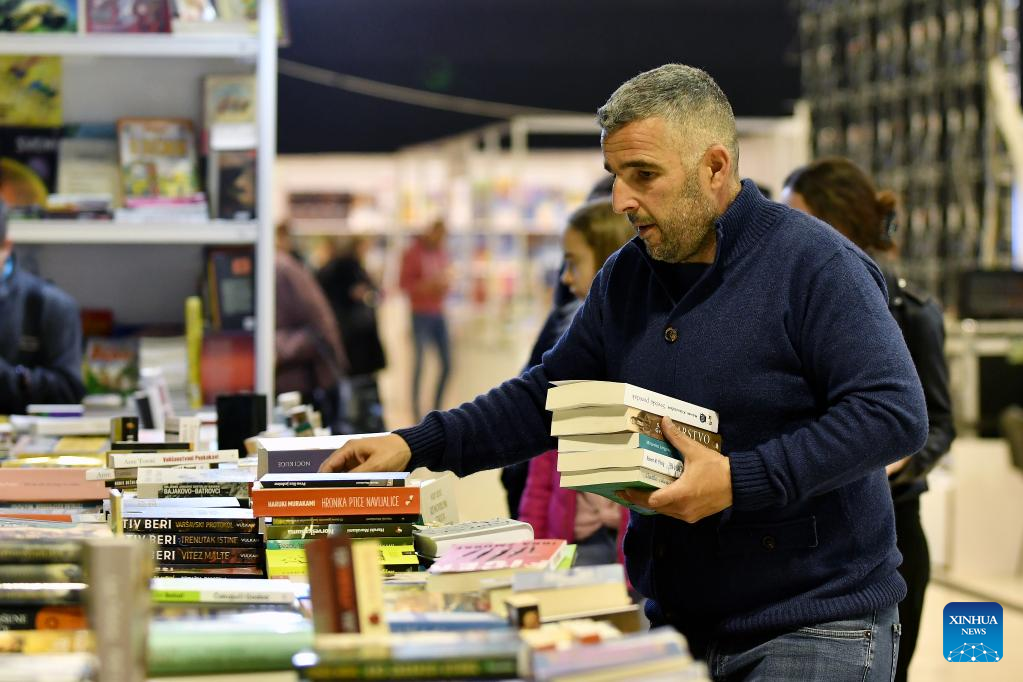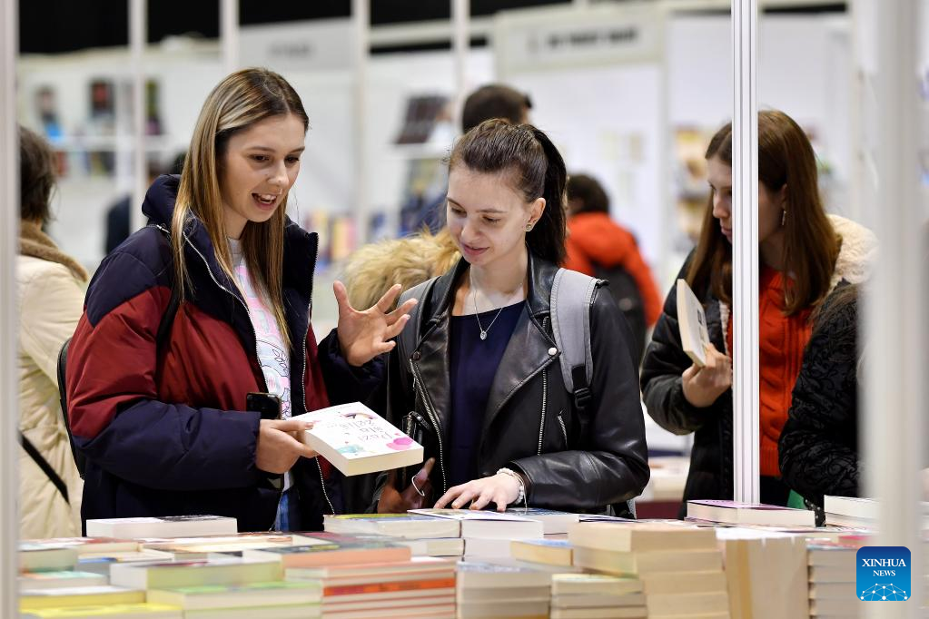 People select books at the International Book Fair in Sarajevo, Bosnia and Herzegovina (BiH), on April 20, 2022. The International Book Fair was opened in Sarajevo on Wednesday. (Photo by Nedim Grabovica/Xinhua)