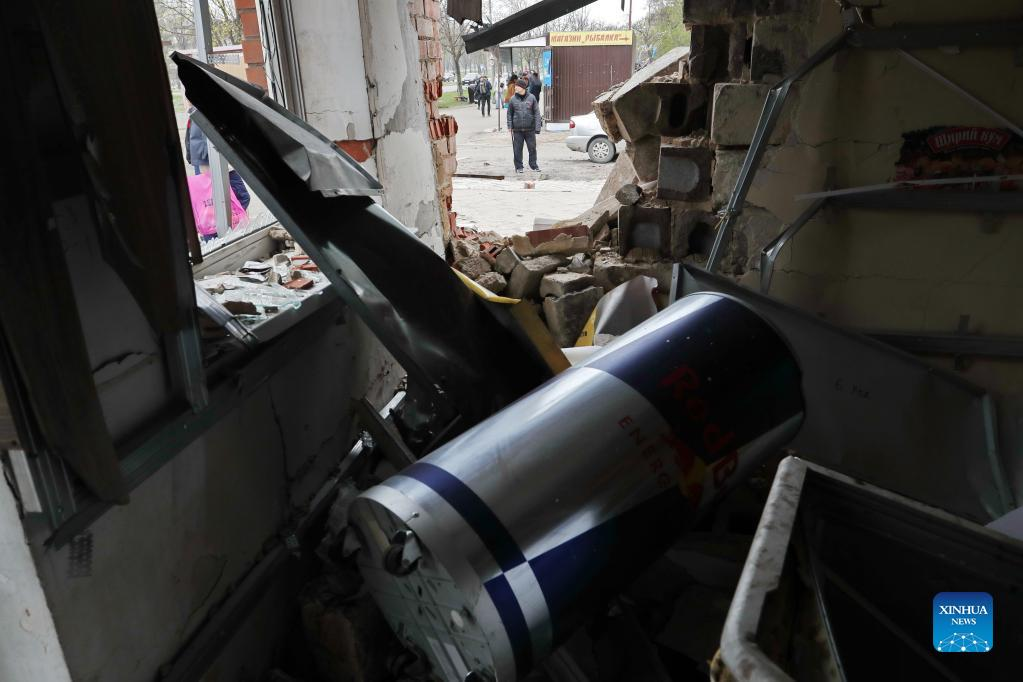 Residents walk past damaged buildings in Mariupol on April 19, 2022. Ukraine and Russia have reached a preliminary agreement on establishing a humanitarian corridor to evacuate women, children and the elderly from the embattled city of Mariupol, Ukrainian Deputy Prime Minister Iryna Vereshchuk said on Wednesday. (Photo by Victor/Xinhua)