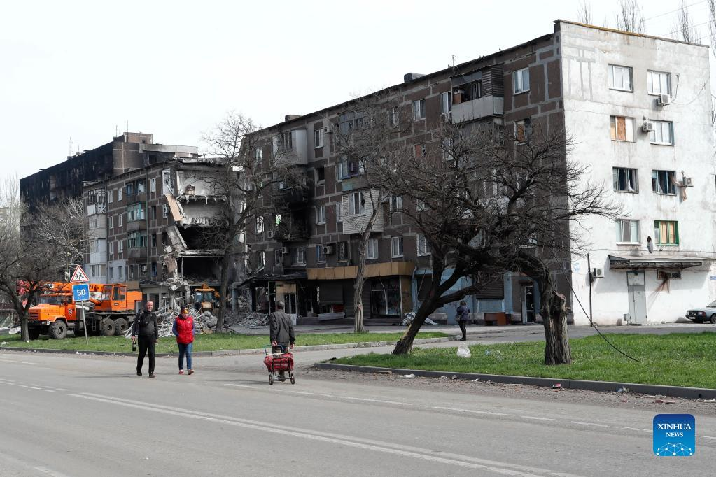 Residents walk past damaged buildings in Mariupol on April 19, 2022. Ukraine and Russia have reached a preliminary agreement on establishing a humanitarian corridor to evacuate women, children and the elderly from the embattled city of Mariupol, Ukrainian Deputy Prime Minister Iryna Vereshchuk said on Wednesday. (Photo by Victor/Xinhua)