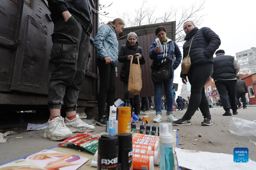 Residents shop at a market in Mariupol on April 19, 2022. Ukraine and Russia have reached a preliminary agreement on establishing a humanitarian corridor to evacuate women, children and the elderly from the embattled city of Mariupol, Ukrainian Deputy Prime Minister Iryna Vereshchuk said on Wednesday. (Photo by Victor/Xinhua)