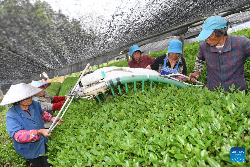 At present, the tea company in Fusheng Township owns nearly 10,000 mu (about 667 hectares) of standardized tea gardens with a yearly matcha output of about 800 tonnes, which helped more than 500 local farmers increase income. (Xinhua/Weng Xinyang)