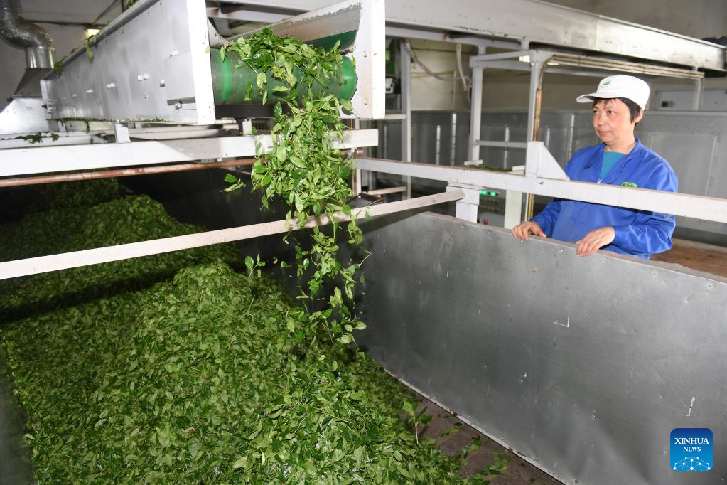 A worker works at a tea workshop in Shaoxing, east China's Zhejiang Province, April 20, 2022. Spring tea harvest season has started at a matcha producing base in Fusheng Township of Shaoxing.