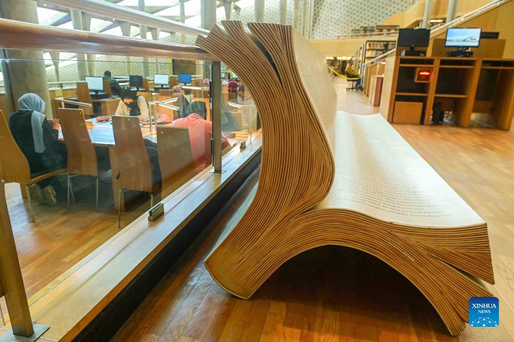 Photo shows a view of the interior of the Bibliotheca Alexandrina in Alexandria, Egypt on April 19, 2022. Bibliotheca Alexandrina, a massive unique library and cultural symbol of the Egyptian Mediterranean coastal city of Alexandria which was founded by King Alexander the Great some 2,300 years ago, features a disc-shaped exterior and 11 internal levels, all under one glistening, tilting roof. The iconic library was inaugurated in 2002 as a revival of the original ancient Library of Alexandria, which was one of the largest and most significant libraries worldwide before being destroyed by a fire a few decades BC. (Photo by Ahmed Draz/Xinhua)