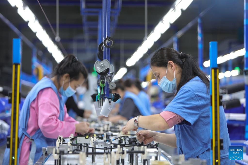 Workers process wiring harness at a factory in Anshan City, northeast China's Liaoning Province, April 19, 2022. Anshan City in Liaoning is in an orderly work resumption with strict epidemic prevention measures in place. (Xinhua/Wang Yijie)