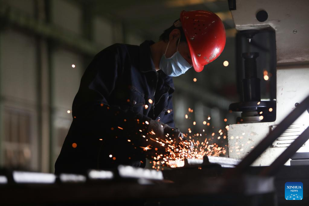 A worker operates at an automobile parts factory in Anshan City, northeast China's Liaoning Province, April 19, 2022. Anshan City in Liaoning is in an orderly work resumption with strict epidemic prevention measures in place. (Xinhua/Yao Jianfeng)
