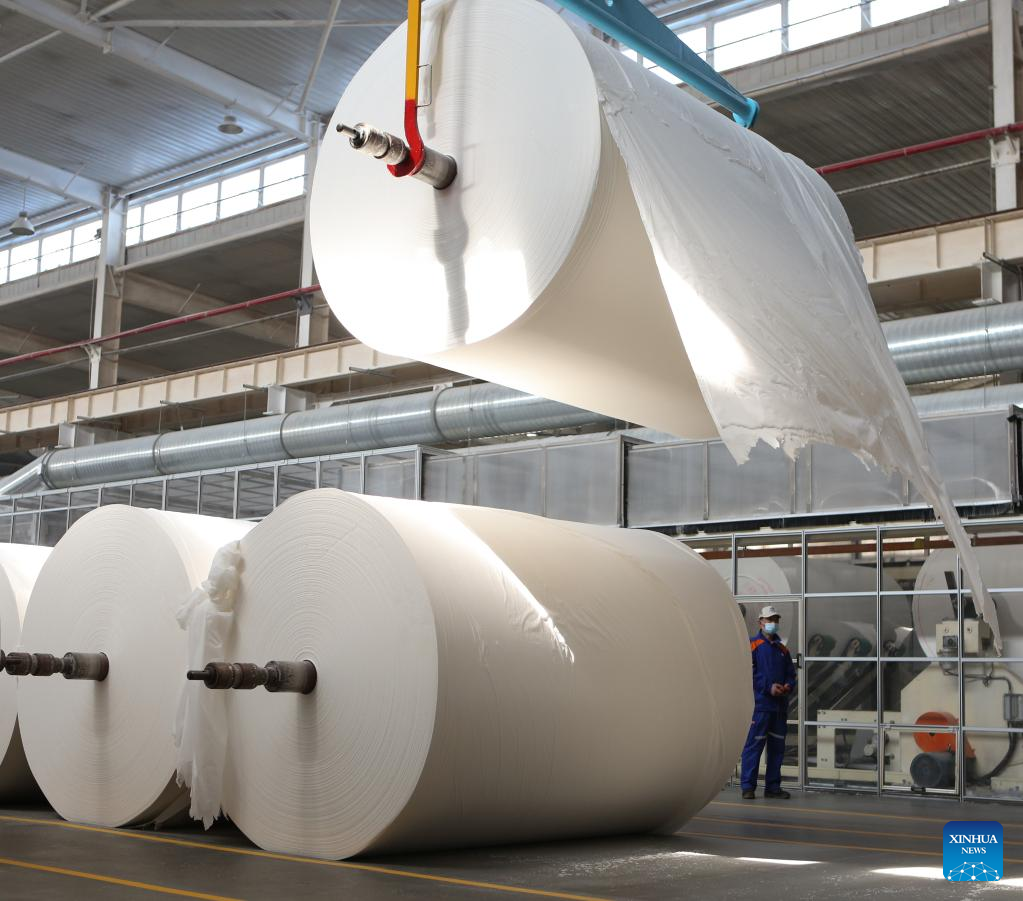 A worker operates a machine to lift raw materials at a tissue making factory in Anshan City, northeast China's Liaoning Province, April 19, 2022. Anshan City in Liaoning is in an orderly work resumption with strict epidemic prevention measures in place. (Xinhua/Wang Yijie)
