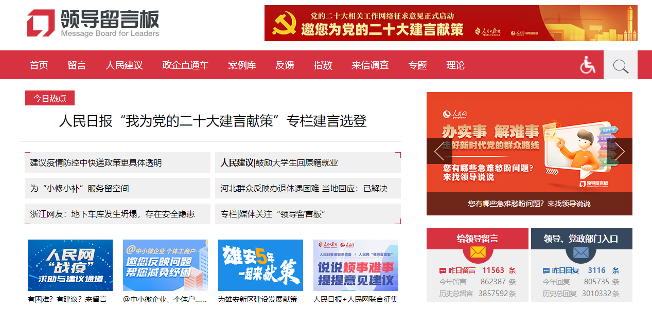 On April 15, 2022, a section for soliciting public opinion and receiving suggestions regarding the 20th CPC National Congress to be held in the second half of 2022 was launched via the Message Board for Leaders and People’s Daily app, which received nearly 10,000 suggestions in the first 12 hours after it was launched.