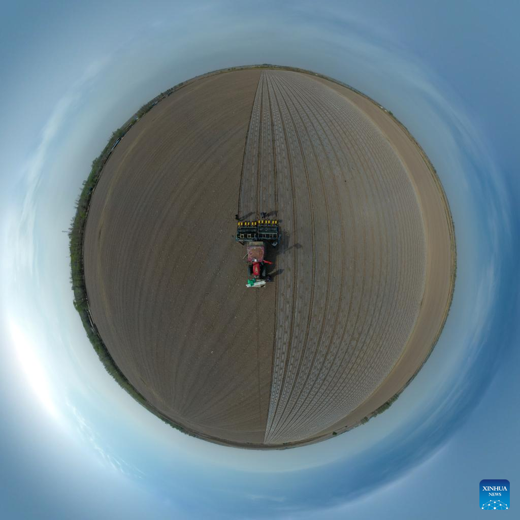 This spherical panorama taken with a drone on April 19, 2022 shows a farming machine working in a cotton field in a farm of a division of Xinjiang Production and Construction Corps in northwest China's Xinjiang Uygur Autonomous Region.