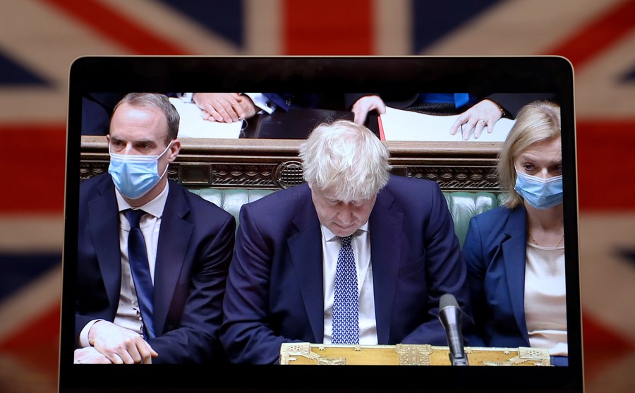 File photo taken on Jan. 12, 2022 shows British Prime Minister Boris Johnson (C) on a screen as he attends the weekly session of Prime Minister's Questions in London, Britain. (Xinhua/Li Ying)