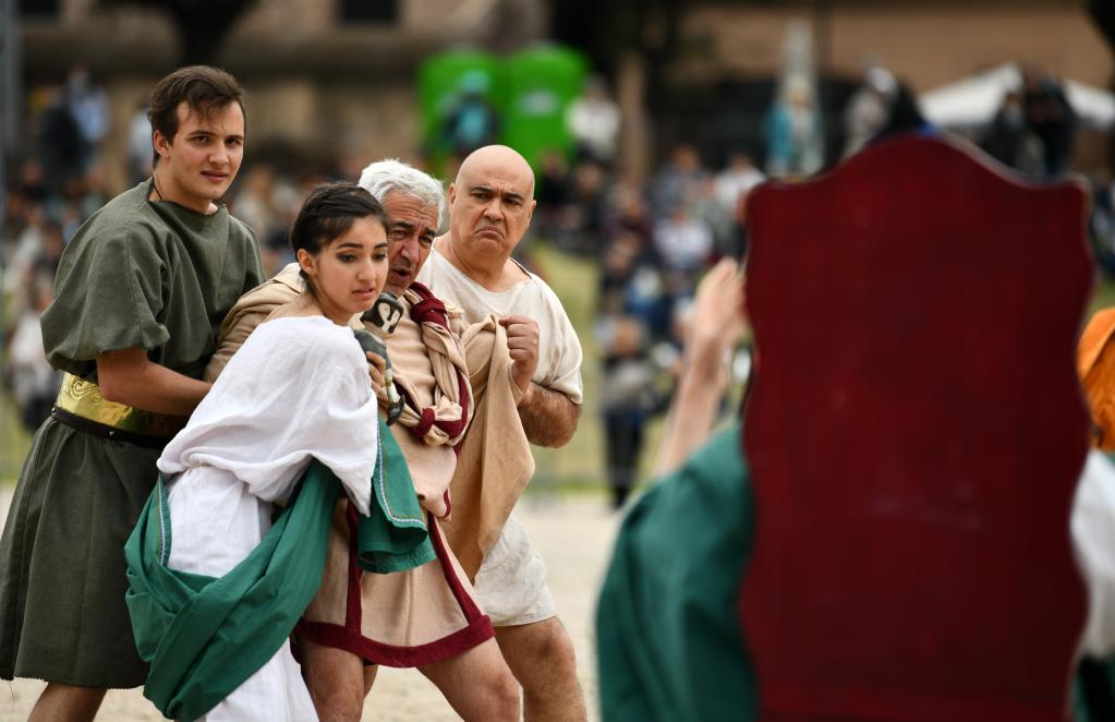 Performers re-enact the birth of Rome to mark the city's birthday at the Circus Maximus in Rome, capital of Italy, on April 21, 2022. According to legend, Rome was founded on April 21, 753 B.C. (Xinhua/Jin Mamengni)