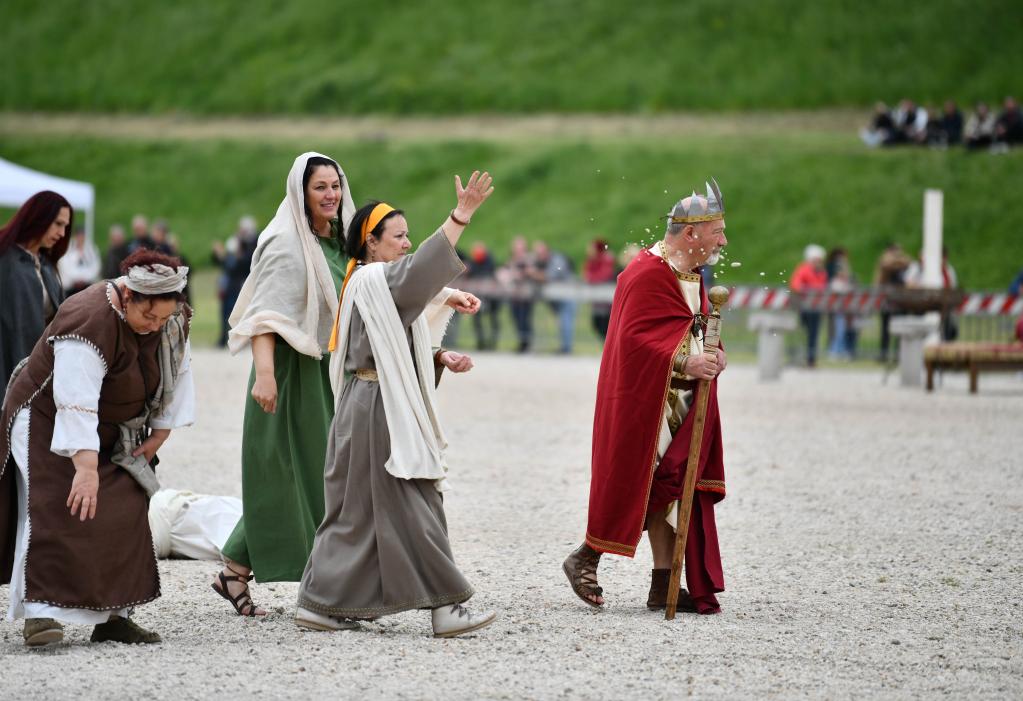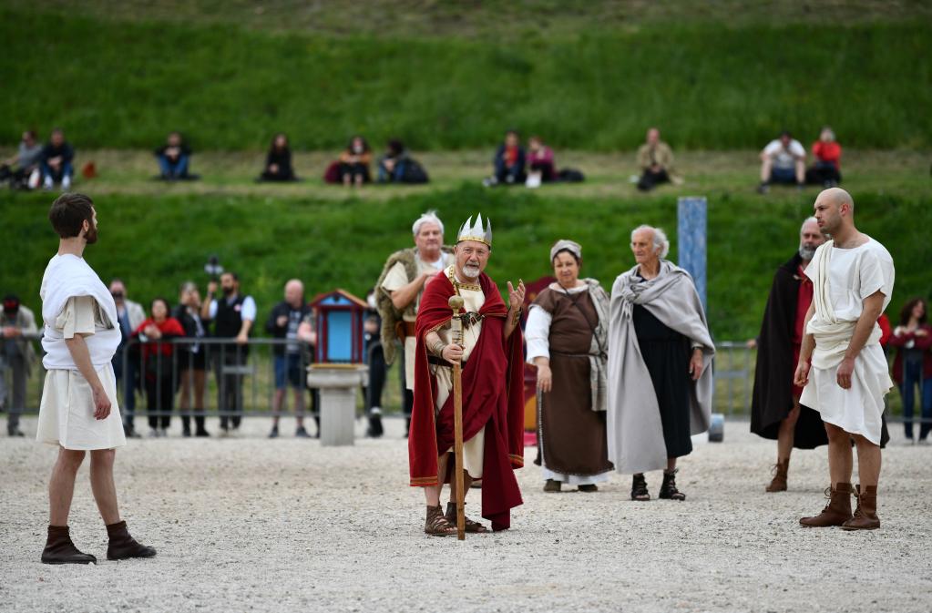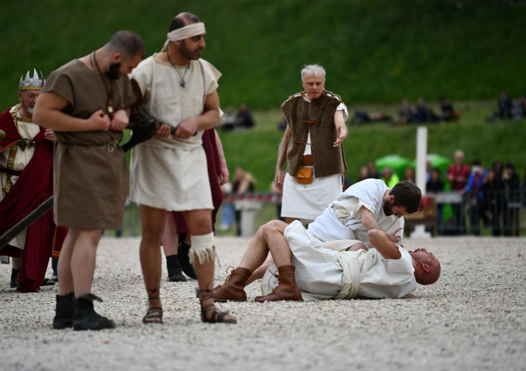 A performer takes part in a show to re-enact the birth of Rome to mark the city's birthday at the Circus Maximus in Rome, capital of Italy, on April 21, 2022. According to legend, Rome was founded on April 21, 753 B.C. (Xinhua/Jin Mamengni)