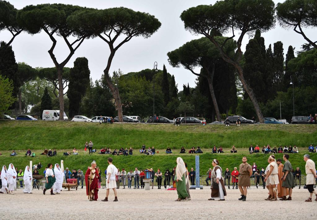 Visitors watch the re-enactment of the birth of Rome to mark the city's birthday at the Circus Maximus in Rome, capital of Italy, on April 21, 2022. According to legend, Rome was founded on April 21, 753 B.C. (Xinhua/Jin Mamengni)