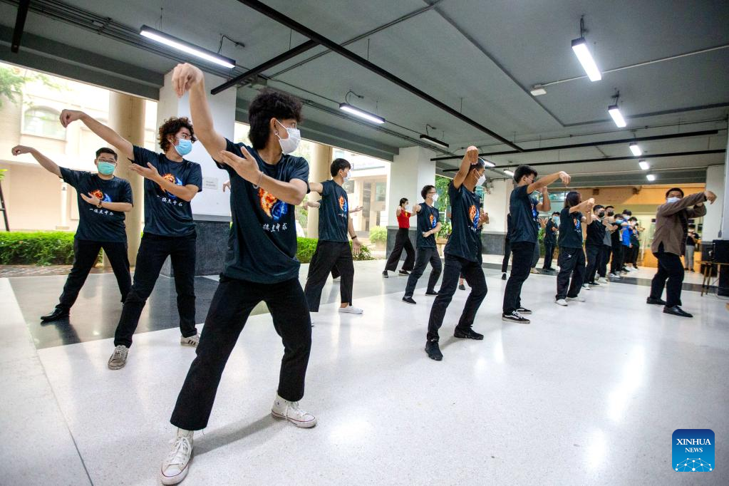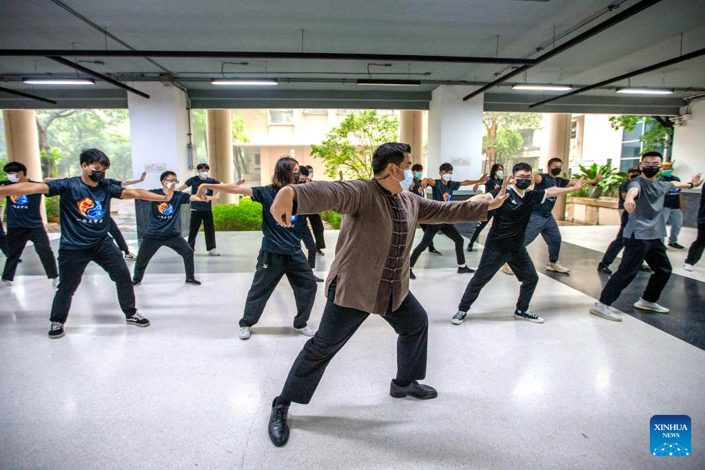 Ekarat Janrathitikarn (1st R), Thai dean of the Maritime Silk Road Confucius Institute, teaches Chinese Tai Chi during a class at Dhurakij Pundit University in Bangkok, Thailand, April 21, 2022. A one-month Tai Chi course is held by Maritime Silk Road Confucius Institute in Dhurakij Pundit University, which attracts more than 40 students to take part in. (Xinhua/Wang Teng)