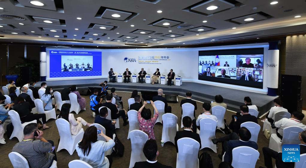 Photo taken on April 21, 2022 shows a session themed "Belt and Road: A New Practice of Cooperative Development" during the Boao Forum for Asia (BFA) Annual Conference 2022 in Boao, south China's Hainan Province. (Xinhua/Yang Guanyu)