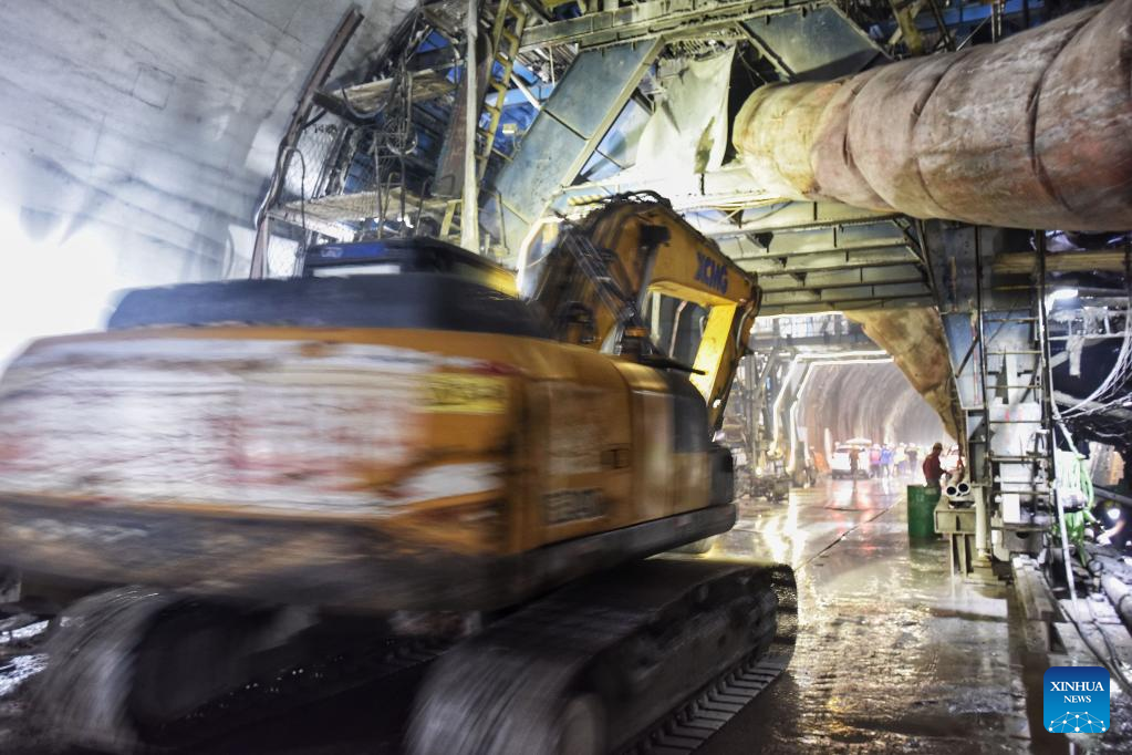 Workers are seen at the construction site of Futoushi Tunnel of Guangzhou-Shanwei Railway in Huidong County of Huizhou, south China's Guangdong Province, April 22, 2022. The Futoushi tunnel of Guangzhou-Shanwei Railway was drilled through on Friday. The 206.2km-long Guangzhou-Shanwei Railway with a maximum speed of 350 km per hour is expected to be put into operation in 2023. (Xinhua/Liu Dawei)